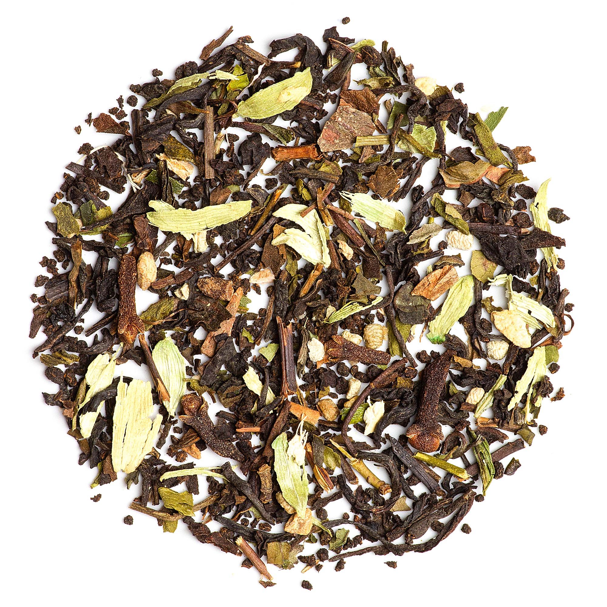 Spices enveloped in a wet brown sheen, with pistachio cardamom husks visible amongst unfurled shiny brown tea leaves rendered fresh by a woody earthiness of wet cassia bark and piquant by spicy-sweet cardamom.